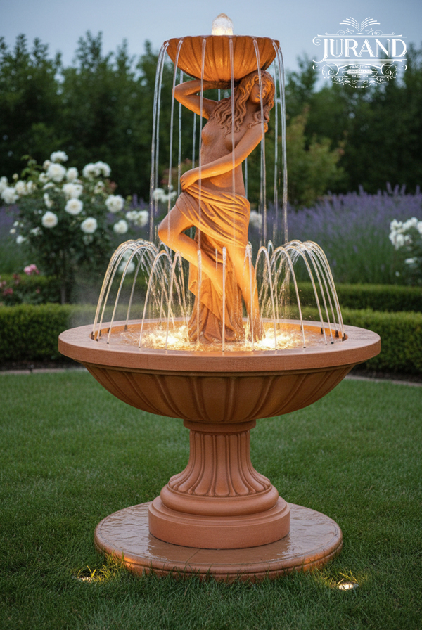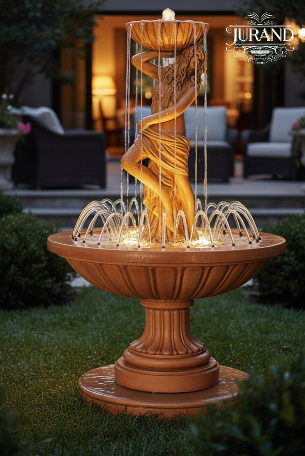 Średniej wielkości fontanna o zastosowaniu zewnętrznym/wewnętrznym. Występująca w komplecie z ringiem z dyszami fontannowymi. Posiada dwa źródła wypływu wody co daje piękny szum wody oraz przyciągający oko efekt wizualny. Fontanna idealnie sprawdzająca się na suchej powierzchni, w zaciszu malutkich i średnich ogrodów. Piękna forma dziewczyny trzymającej muszlę działa jak magnes i nie sposób przejść obojętnie obok tej fontanny. Stosuje się ją również w oczkach wodnych.