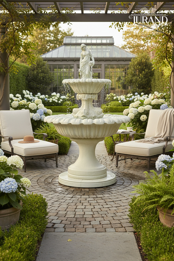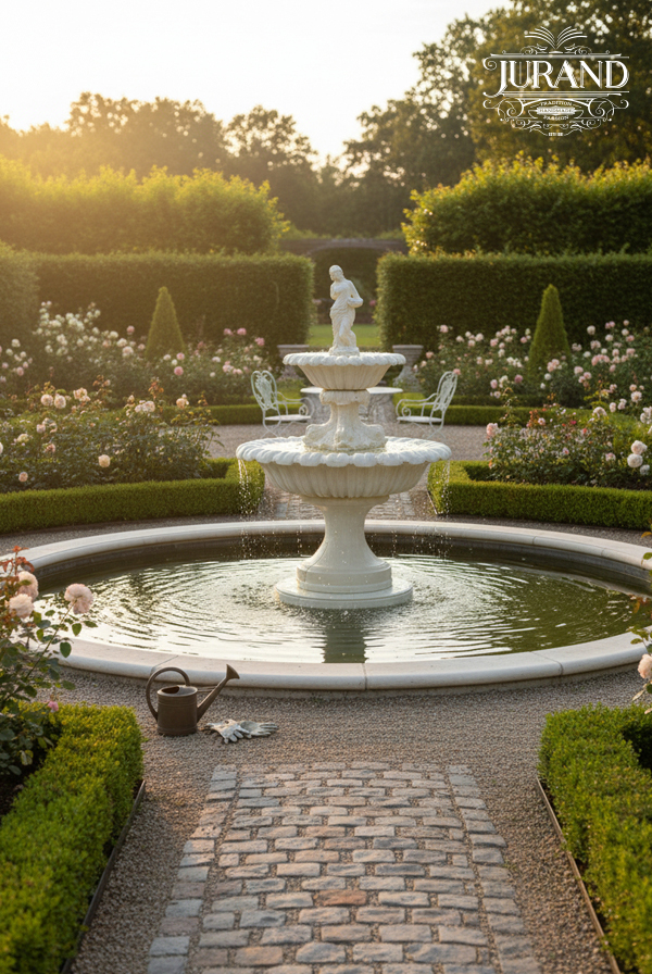 Dwupoziomowa fontanna o eleganckim kształcie mis. Jej ozdobą jest stojąca na szczycie Rzymianka w todze.